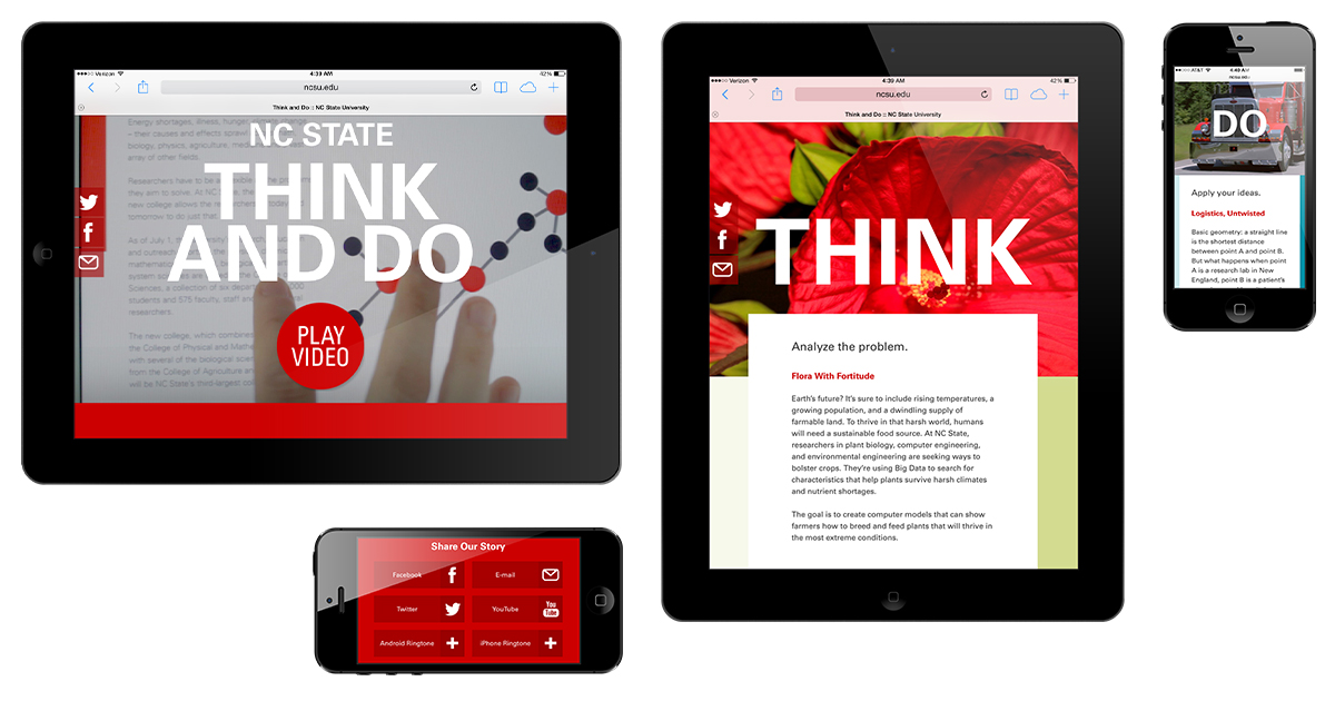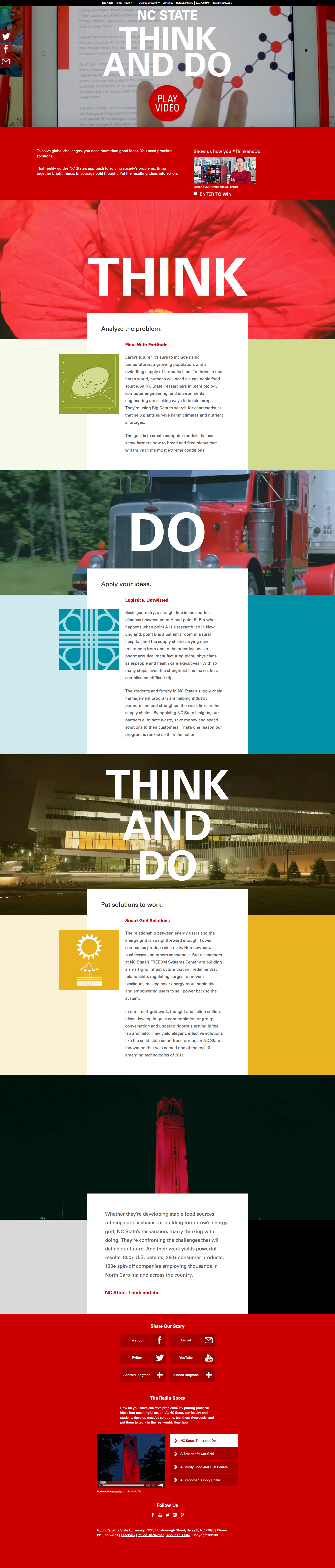 We’ve made the Think and Do microsite the destination for several strategic campaigns, driving to it from the university homepage, print and web ads, and a range of social media channels. From its August launch to October 1, the site generated more than 20,000 views, including more than 5,000 views of its centerpiece video. At the time, the Think and Do site is the most interactive microsite we’d built, and those interactions are driving engagement: site visitors spend twice as much time on it as the average ncsu.edu user spends on other pages.
