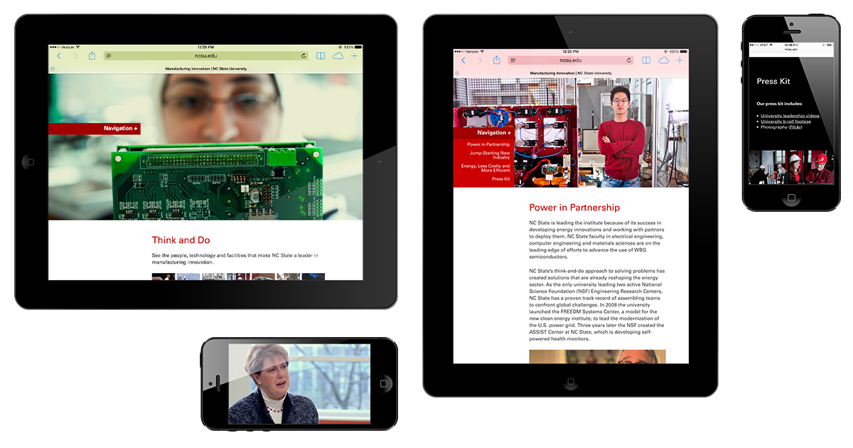 As the centerpiece of a major White House economic development push, the PowerAmerica announcement was bound to bring national and international attention to NC State. Our goal was to build rich, compelling web experience that would make the most of the extra focus. We needed a microsite that would engage users, inspire them to share our content and draw them into content elsewhere in the NC State web ecosystem.