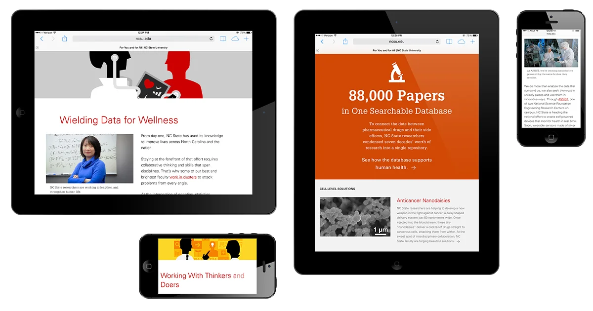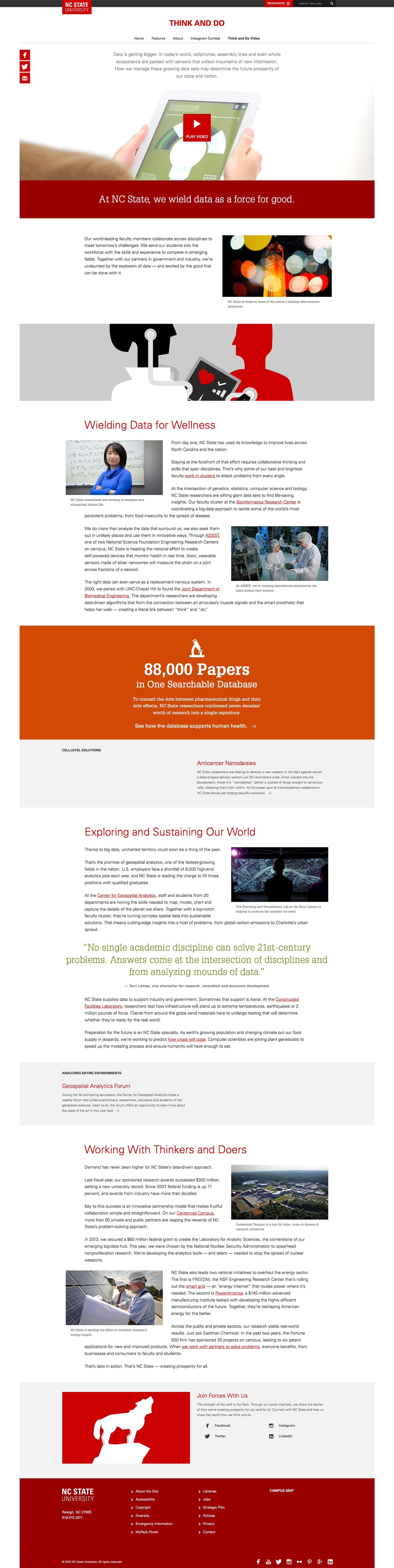 With an even more expansive and responsive design built into NC State's new brand, the Think and Do microsite includes the animated television spot; compelling supporting content that illustrates our signature mix of immersive teaching, applicable research, collaborative study and economic development. Continuing on the foundations we built with the 2013 launch, the new Think and Do campaign continues to utilize bold photography and impactful infographics.