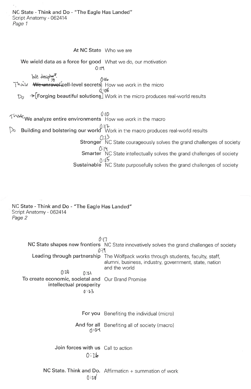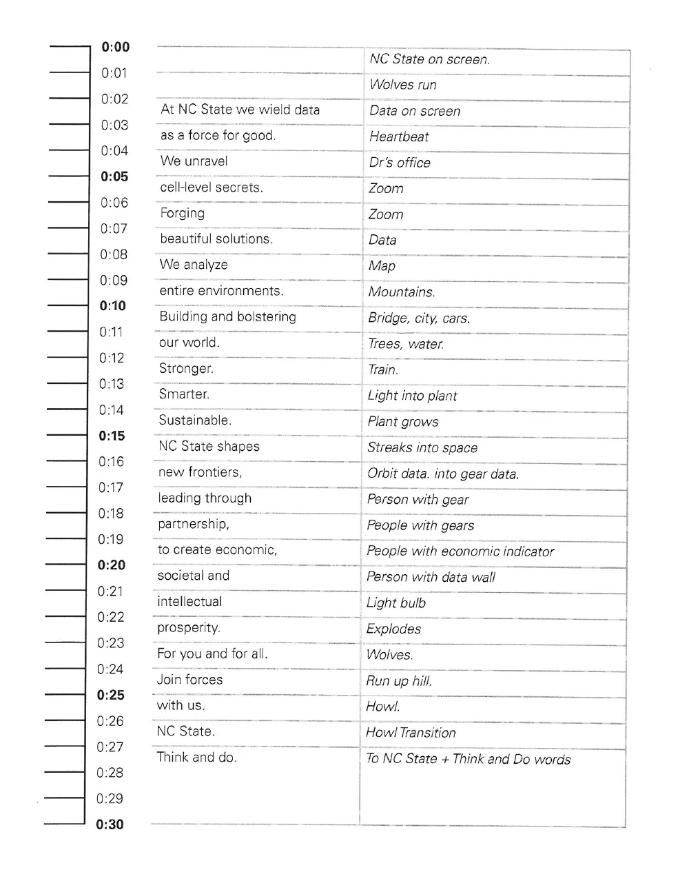 A script anatomy was then drafted that described the overall theme pacing through the spoken messaging within the commercial narration.