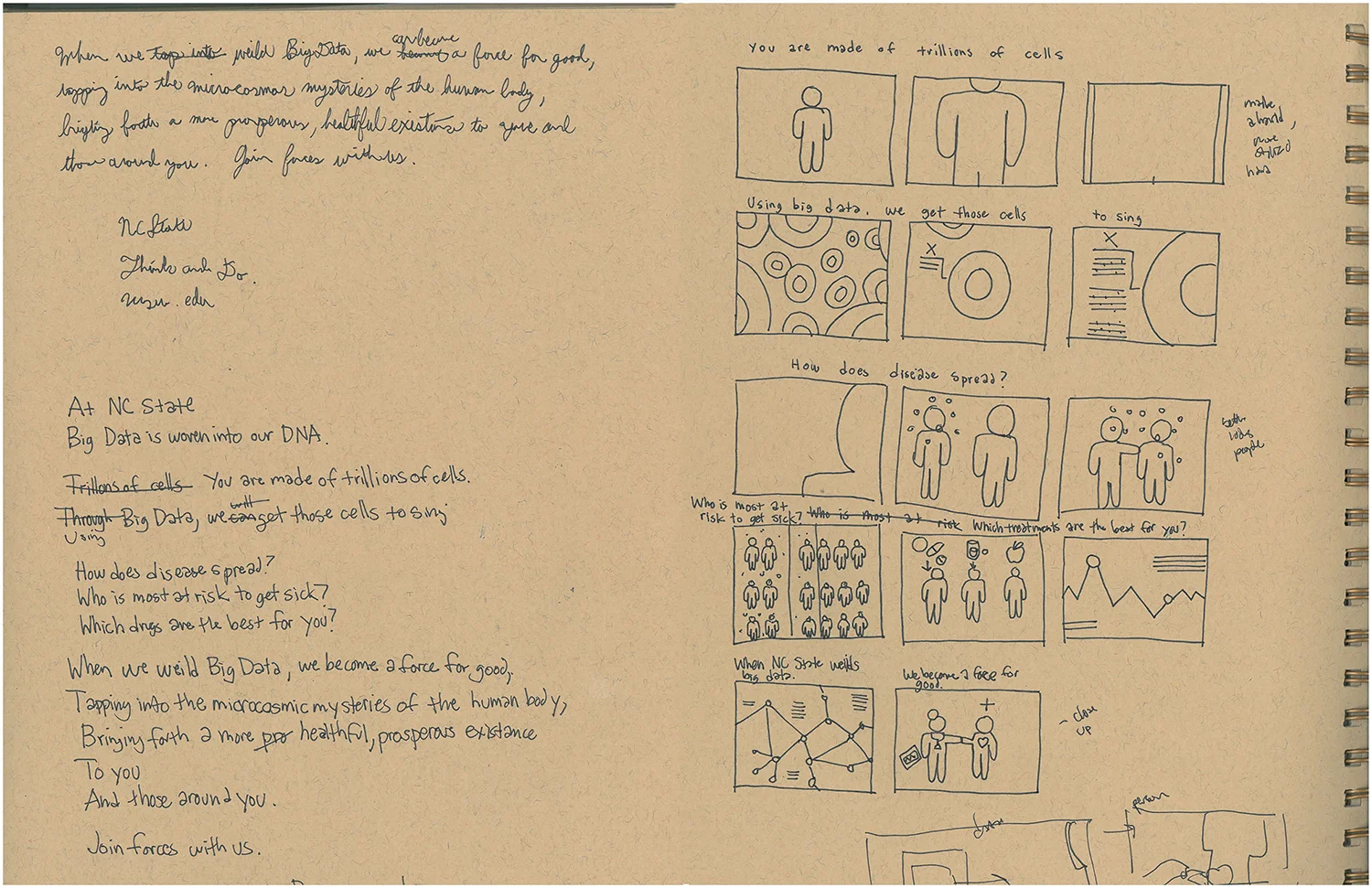 In keeping with the ideas of impact within the micro/macro world that NC State is constantly investigating, storyboard thumbnails were sketched out in an attempt to define rhythm and interconnectivity.